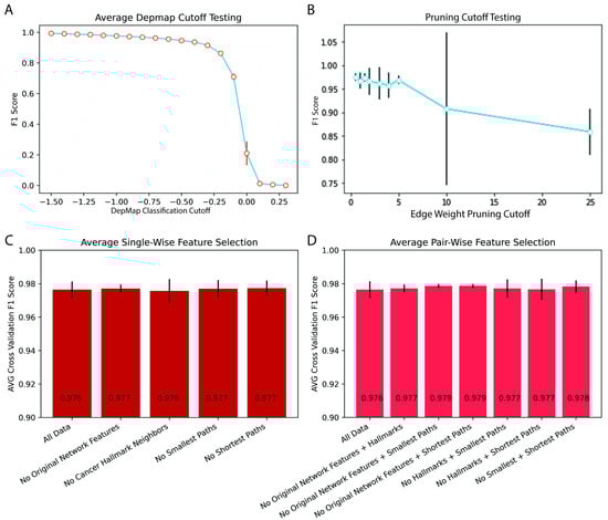 Dependency scores are presented by DepMap on a continuous scale, and initially, we used the DepMap-defined cutoff of −1 to call each average cancer dependency score dependent or non-dependent. DepMap scores were generated such that nonessential reference genes had a median score of zero. To ensure model robustness, we examined the effect of varying DepMap cutoffs on the F1 score. DepMap thresholds ranging from −1.50 to 0.25 were tested. F1 scores were poor (<0.5) until the cutoff decreased to under −0.25. Below −0.50, the curve plateaued, and only small changes to the F1 score were appreciated with further decreases in the DepMap cutoff (Figure 3A). F1 score significantly decreased as the cutoff increased to >0.05, indicating a greater difficulty in predicting close to neutral dependencies or gain of function knockouts (Figure 3A). The cancer specificity of this finding was tested, and again we found that performance was cancer-agnostic (Figure S2A). From this, we concluded that network prediction is not sensitive to dependency cutoffs < −0.25 and thus moved forward with the previously established dependency cutoff of −1 [7,20,21].
