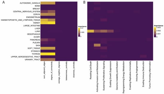 Feature Importance for Traditional Network and Cancer Hallmark Features. (A,B) Feature importance by tumor class for (A) traditional network and (B) cancer hallmark features.