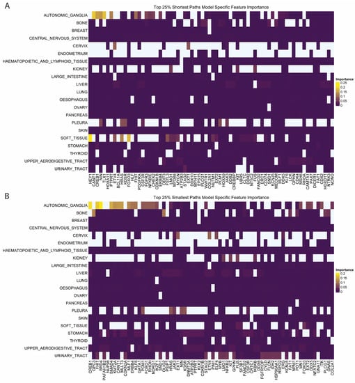 Feature Importance for Shortest and Smallest Path Features. (A,B) Feature importance by tumor class for (A) shortest path to cancer gene census genes and (B) smallest path to cancer gene census genes. The topmost important features are included. Extended plots shown in Figures S5 and S6.