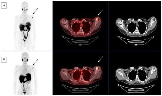 [68Ga]Ga-PSMA-11 PET-CT before (A) and after (B) 4 cycles of RLT by [177Lu]Lu-PSMA-617 with left humeral head lesion (black and white arrow).