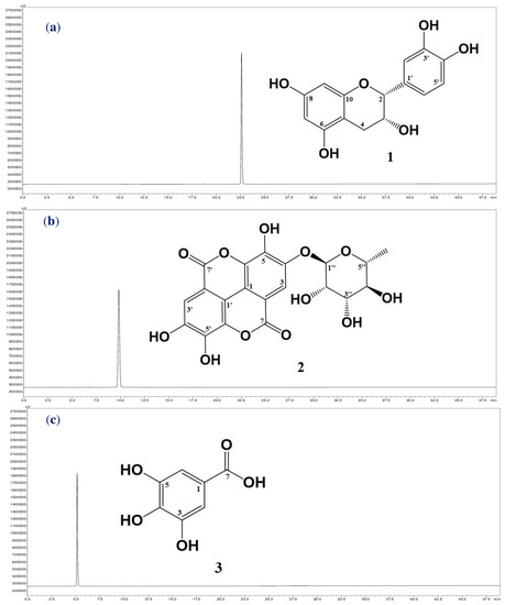 Analysis of the mass, nuclear magnetic resonance (NMR) spectra, and comparison with previously reported constituents revealed that the chemical structures of purified compounds (TTS312-1, TTS312-2, and TTS312-3) were (−)-epicatechin (1) [16], eschweilenol C (2) (EAR) [17], and gallic acid (GA) (3) [18]. The chemical structures of these identified compounds are shown in Figure 1, and their NMR and mass spectra data were recorded and are summarized below: