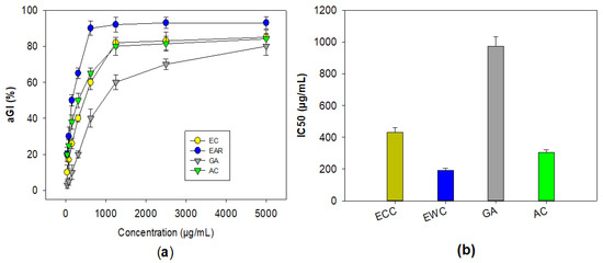 The α-glucosidase inhibitory effect of purified compounds from Terminalia triptera Stapf. The activity was expressed as inhibition values (a) and IC50 values (b). The purified compounds, including (−)-epicatechin (ECC), eschweilenol C (EWC), and gallic acid (GA), and acabose (AC) were tested.