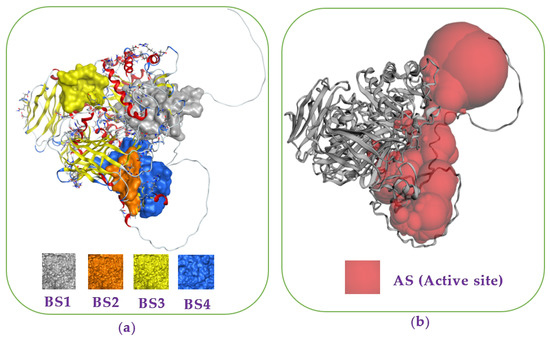 Protein α-glucosidase and the most binding sites (BSs) (a) found on α-glucosidase via using the site finder function of the MOE-2015.10 software. The catalytic site prediction of extracellular domain of α-glucosidase (b) found via using the CASTp3.0 server [35].