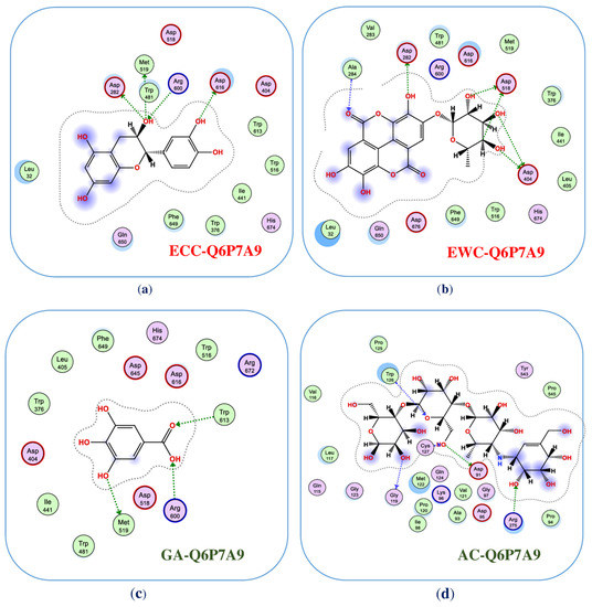 The interaction of ligands with the enzyme at the binding sites (2-dimensional structures). Of these, (−)-epicatechin (ECC), eschweilenol C (EWC), gallic acid (GA), and acarbose (AC) interacted with mammalian α-glucosidase (Q6P7A9) at the active zones, namely, as ECC-Q6P7A9 (a), EWC-Q6P7A9 (b), GA-Q6P7A9 (c), and AC-Q6P7A9 (d), respectively.