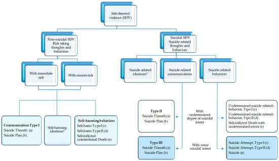 Self-directed violence includes suicidal ideations, communications and behaviors according to the Silverman et al. classification [,], in which the result of the behavior, the entity of the act, the degree of intentionality and the knowledge or awareness of the perpetrators are taken into account as results of this behavior [], as can be seen in Figure 1.