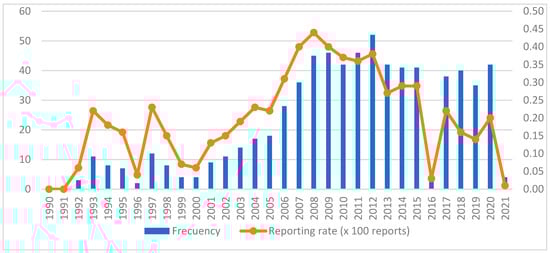 The 710 reports were mostly received from the year 2007 onwards (n = 554; 78%), with the year 2012 standing out (n = 52; 7.3%). However, the year with the highest notification rate was 2008 (Figure 2).