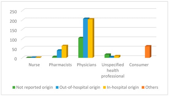 Analyzing the origin of the notifier, in-hospital pharmacists notified 58.90% (n = 63) of the cases compared to 36.40% of out-of-hospital pharmacists, and 4.70% (n = 5) were not reported. Out-of-hospital physicians reported 40.10% (n = 207) of the cases, in-hospital physicians 39.5% (n = 204), and not reported 20.30% (n = 105), as shown in Figure 3.