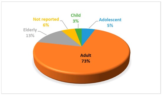 The mean age was 45.52 years with a standard deviation of 18.89 years, with ages ranging from 1 to 94 years. The highest number of reports was found in the adult group (n = 518; 73%) (Figure 4).