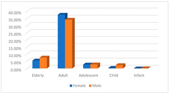 The distribution of reports according to sex showed that 344 (48.5%) were female and 355 (50%) were male. However, 11 reports did not include gender (1.5%). Figure 5 shows the percentage considering age group and sex, where differences were only observed in the child age group, with 84.20% (n = 16) belonging to the male sex compared to 15.8% (n = 3) of the female sex.