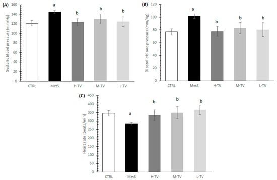 Effects of TVH administration on blood pressure and heart rate. (A) Systolic blood pressure (SBP); (B) diastolic blood pressure (DBP); (C) heart rate (HR). CTRL: control group of healthy non-treated rats; MetS: control group of rats with induced metabolic syndrome; H-TV: rats with metabolic syndrome treated with high dose of T. versicolor; M-TV: rats with metabolic syndrome treated with medium dose of T. versicolor; L-TV: rats with metabolic syndrome treated with low dose of T. versicolor. Data are presented as means ± standard deviation. Data are presented as means ± standard deviation. Statistical significance at the level p < 0.05: a compared to CTRL; b compared to MetS.