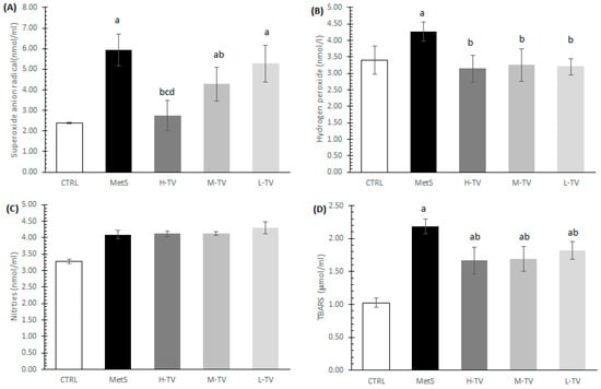 Effects of TVH administration on antioxidant parameters. (A) Superoxide anion radical (O2−), (B) hydrogen peroxide (H2O2); (C) nitrites (NO2−); (D) index of lipid peroxidation (TBARS). CTRL: control group of healthy non-treated rats; MetS: control group of rats with induced metabolic syndrome; H-TV: rats with metabolic syndrome treated with high dose of T. versicolor; M-TV: rats with metabolic syndrome treated with medium dose of T. versicolor; L-TV: rats with metabolic syndrome treated with low dose of T. versicolor. Data are presented as means ± standard deviation. Statistical significance at the level p < 0.05: a compared to CTRL; b compared to MetS; c compared to H-TV group; d compared to M-TV group.