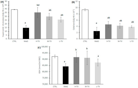 Effects of TVH administration on antioxidant parameters. (A) Superoxide dismutase (SOD), (B) catalase (CAT) and (C) reduced glutathione (GSH). CTRL: control group of healthy non-treated rats; MetS: control group of rats with induced metabolic syndrome; H-TV: rats with metabolic syndrome treated with high dose of T. versicolor; M-TV: rats with metabolic syndrome treated with medium dose of T. versicolor; L-TV: rats with metabolic syndrome treated with low dose of T. versicolor. Data are presented as means ± standard deviation. Statistical significance at the level p < 0.05: a compared to CTRL; b compared to MetS; d compared to L-TV group.
