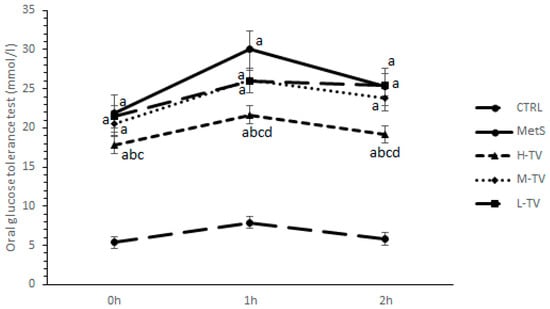 Effects of TVH administration on oral glucose tolerance test (OGTT). CTRL: control group of healthy non-treated rats; MetS: control group of rats with induced metabolic syndrome; H-TV: rats with metabolic syndrome treated with high dose of T. versicolor; M-TV: rats with metabolic syndrome treated with medium dose of T. versicolor; L-TV: rats with metabolic syndrome treated with low dose of T. versicolor. Data are presented as means ± standard deviation. Statistical significance at the level p < 0.05: a compared to CTRL; b compared to MetS; c compared to M-TV group; d compared to L-TV group.
