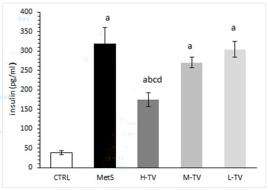 Effects of TVH supplementation on serum insulin level. CTRL: control group of healthy non-treated rats; MetS: control group of rats with induced metabolic syndrome; H-TV: rats with metabolic syndrome treated with high dose of T. versicolor; M-TV: rats with metabolic syndrome treated with medium dose of T. versicolor; L-TV: rats with metabolic syndrome treated with low dose of T. versicolor. Data are presented as means ± standard deviation. Statistical significance at the level p < 0.05: a compared to CTRL; b compared to MetS; c compared to M-TV group; d compared to L-TV group.