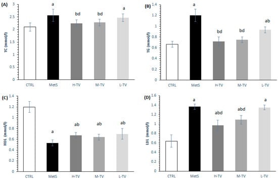 Effects of TVH supplementation on lipid parameters: (A) total cholesterol—TC; (B) triglycerides—TG; (C) high density lipoprotein (HDL) and (D) low density lipoprotein (LDL). CTRL: control group of healthy non-treated rats; MetS: control group of rats with induced metabolic syndrome; H-TV: rats with metabolic syndrome treated with high dose of T. versicolor; M-TV: rats with metabolic syndrome treated with medium dose of T. versicolor; L-TV: rats with metabolic syndrome treated with low dose of T. versicolor. Data are presented as means ± standard deviation. Statistical significance at the level p < 0.05: a compared to CTRL; b compared to MetS; c compared to M-TV group; d compared to L-TV group.