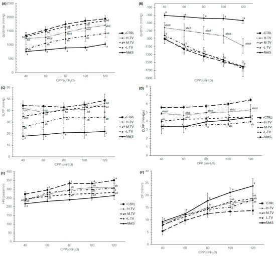 The treatment with TVH remarkably increased HR at all pressures except 40 cmH2O compared to the non-treated MetS rats, while the most prominent effect was achieved in the H-TV group, and especially at 80 and 100 cmH2O, almost reaching the values in the CTRL group (p < 0.05; Figure 7E). The values of CF in the CTRL group were significantly decreased at all CPPs compared to the MetS rats (p < 0.05; Figure 7F). However, there were no significant differences observed in the CF values at the lower CPPs (40–60 cmH2O) between the TVH-treated group and the rats with MetS. On the other hand, at higher pressures (80–120 cmH2O), the MetS hearts showed highest CF values, while supplementation with TVH in all three applied doses markedly reduced CF compared with the MetS group (p < 0.05), with no dose-dependent effect noticed (Figure 7F).