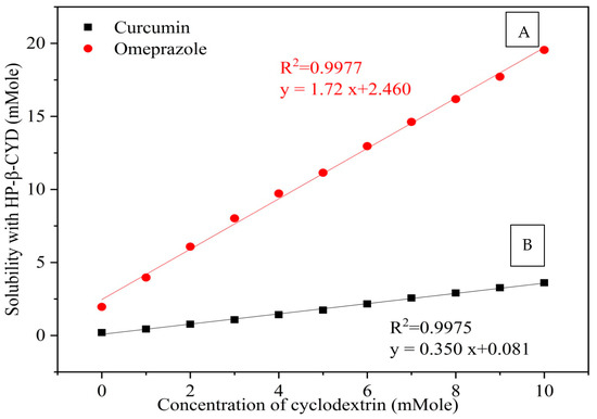 Phase solubility diagram of (A) CURC with HPR-β-CYD, (B) OMP with HPR-β-CYD systems using water at 25 °C. HPR-β-CYD: hydroxypropyl-β-cyclodextrin, OMP: omeprazole, CURC: curcumin.