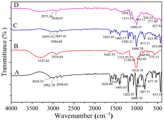 The FTIR spectra of OMP, HPR-β-CYD, the physical mixture of OMP and HPR-β-CYD, and the HPR-β-CYD/OMP inclusion complex are shown in Figure 2A,D. OMP displayed its characteristic bands (Figure 2A), especially the C = N bond stretching vibration bands at about 1626 cm−1, the N-H bending at about 1405 cm−1, and the asymmetric C-O-C stretching bands at about 1203 cm−1. These described OMP spectral features were distinguishable from those obtained from the HPR-β-CYD FTIR spectrum (Figure 2B). The FTIR of the OMP and HPR-β-CYD physical mixture was additive, with an observed reduction in the peak intensities of both compounds due to their dilution in their mixture (Figure 2C).