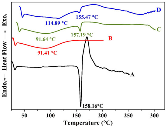 Other evidence for the formation of the inclusion complex is the comparison between the DSC thermograms of OMP, HPR-β-CYD, the physical mixture of OMP and HPR-β-CYD, and the HPR-β-CYD/OMP inclusion complex (Figure 3A–D). Concerning the OMP complexation, the endothermic peaks at 157.19 °C and 155.47 °C correspond to the OMP fusion in the drug–cyclodextrin physical mixture and the OMP-HPR-β-CYD kneaded product, respectively. However, the OMP-HPR-β-CYD kneaded product manifests a marked reduction in the drug enthalpy value relative to that observed in the physical mixture thermogram, where the drug ΔH value in the complex is –7.94, ΔH % is (7.05%) compared to –13.76, and ΔH % is 12.23%. Such a reduction in drug enthalpy in the solvent-processed product relative to the physical mixture suggests at least partial OMP-HPR-β-CYD complexation in the solvent-kneaded OMP-HPR-β-CYD preparation.