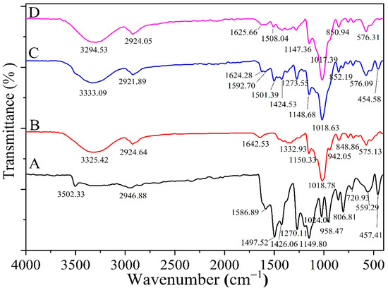 FTIR of (A) free CURC, (B) HRP-β-CYD, (C) HRP-β-CYD-CURC physical mixture, and (D) inclusion complex of HRP-β-CYD/CURC. HPR-β-CYD: hydroxypropyl-β-cyclodextrin, CURC: curcumin.