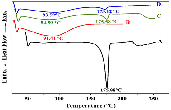 DSC spectra of (A) free CURC, (B) HPR-β-CYD, (C) HPR-β-CYD- CURC physical mixture, and (D) HPR-β-CYD/CURC inclusion complex. HPR-β-CYD: hydroxypropyl-β-cyclodextrin, CURC: curcumin.