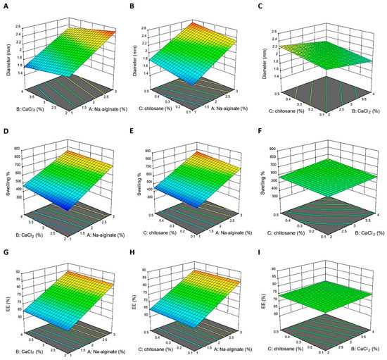 Nine response surface graphs demonstrating the influence of the variables. (A–C) demonstrate different variables’ effect on the diameter. (D–F) show the effect of different variables on the tested swelling %. (G–I) show various variables’ effects on the % entrapment efficiency (%EE) of beads.