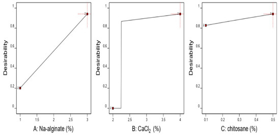 The predicted optimum conditions were found to result from using the maximum value of the variables, CaCl2%, sodium alginate%, and CS%, as depicted in the desirability plot. This resulted in a desirability value equal to 0.941 (Table 1). According to this prediction, the optimum formulation parameters for sodium alginate, CaCl2, and the CS polymer content were 3%, 4%, and 0.5%, respectively (Figure 8). These values corresponded to a formulation with a predicted diameter of 2.60 mm, % swelling of 800.00, and EE of 87.44%.
