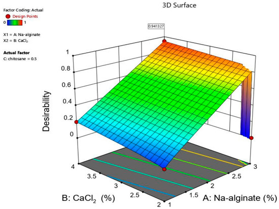 The numerical optimization of design-Expert® software (version 11) enabled the selection of the optimized formula. The optimal formulation was predicted through the mathematical modeling and desirability function calculations (Figure 7). The desirability function was found to increase by increasing the method three variables (Figure 7 and Figure 8). A sharp, steep decrease in the desirability function was noticed at 3% of sodium alginate and 2% of CaCl2. This decrease is justified by the settings of the beads diameter optimization criteria in the desirability function calculation, which was defined to be in the range of 1.5–2.6 mm. The beads diameter exceeded the specified range at 3% of sodium alginate and 2% of CaCl2, causing the desirability function to fall sharply to zero to make the noticed steep decrease in the desirability function plot.