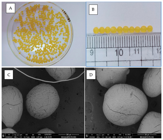 The smooth bead surface significantly prolonged the releasing time [23]. As observed in Figure 9, the form and surface of beads in their wet state were spherical in shape and smooth. The diameter was around 2.60 mm. Figure 9A,B depict the SEM images of the blank and the drug-loaded hydrogel beads, respectively. The microstructure shows the partial collapse of the polymeric network, which manifests as surface fissures. Dehydrating the polymeric beads throughout air drying increases the risk of fractures. Figure 9C depicts SEM micrographs of empty beads, which were more uniform and smaller than the drug-loaded beads shown in Figure 9D.