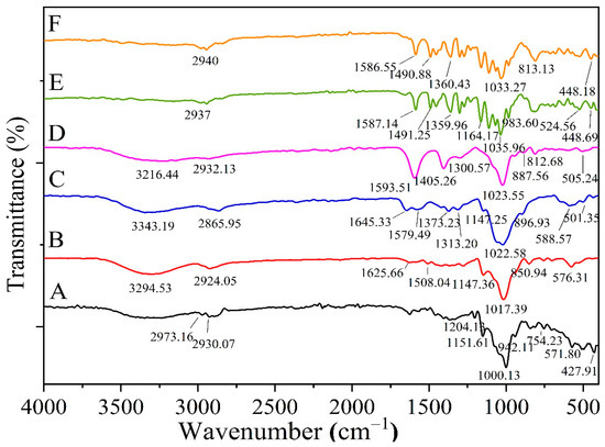 FTIR spectra of (A) HPR-β-CYD/OMP inclusion complex, (B) HPR-β-CYD/CURC inclusion complex, (C) Chitosan, (D) Sodium alginate, (E) Optimal form of the mixture, and (F) Optimal formula of the beads.