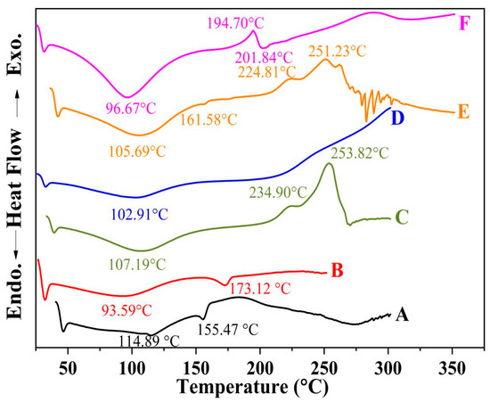 DSC spectra of (A) HPR-β-CYD/OMP inclusion complex, (B) inclusion complex for HPR-β-CYD/CURC, (C) sodium alginate, (D) chitosan, (E) optimized formula physical mixture, and (F) optimized beads formula.