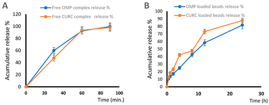 A direct technique was employed to evaluate the bead’s drug content. Briefly, 200 mg of hydrogel beads were weighed and finely ground in a glass mortar. The crushed beads were collected and dispersed in methanol (10 mL), after which the mixture was placed in a shaking water bath at 100 rpm at room temperature (37 ± 0.5 °C) for one day. A syringe equipped with a 0.45 µm filter was utilized for the filtration of the extract. In total, 1 mL of these samples was diluted with 10 mL of methanol, the concentrations for either CURC or OMP were assessed spectrophotometrically (Shimadzu, Kyoto, Japan) with reference to their respective analytical standard curve, and their concentrations were obtained. The encapsulation efficiency for OMP and CURC was calculated by using Equation (3) [36].