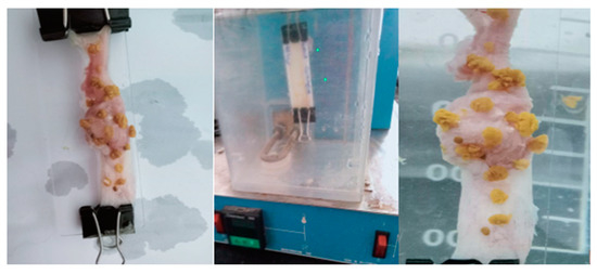 The outcomes of the bio-adhesion tests on beads contain two medicines (OMP and CURC), as shown in Figure 13. Initially, there were 20 beads in the mucosa; after 30 min of flow with 0.1 N HCl solution, there were 20 beads (100%); after 2 h, there were 19 beads (95%) remaining; after 6 h, there were 17 beads (85%). The bio-adhesion capabilities of the beads are considered the most important parameter, since they are directly related to the efficiency of the system in targeting the drug to the gastric and upper duodenal regions. These studies demonstrate that the combination of OMP and CURC in beads has bio-adhesive characteristics.