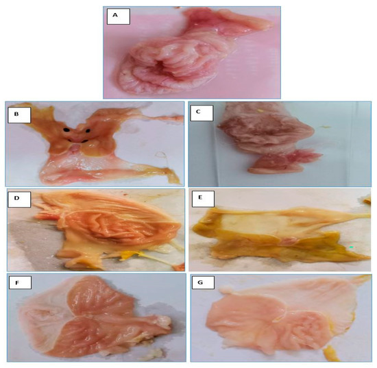 Figure 14 depicts a macroscopical inspection of the rat stomachs. The stomachs of the normal control group (Figure 14A) displayed a healthy mucosal lining, no inflammation, and no blood loss or hyperemia. In contrast, groups 2 and 3 showed substantial stomach mucosa damage (Figure 14B,C). When given orally, indomethacin (50 mg/kg) caused extensive hemorrhagic abrasions, most of which were located on the stomach glandular mucosa segment, and a few or none were located in the antrum. Several ulcer patches of varying sizes and shapes within the stomach mucosa were dark crimson and covered the bulk of the stomach. The stomach mucosa showed exceptional hyperemia. In the stomachs of animals in PUD + free OMP (Figure 14D), the number of ulcers was dramatically reduced. Discontinuous lesions developed in the stomach mucosa, and perforation did not occur in any rat. The stomach mucosa showed exceptional hyperemia. In the stomachs of animals in PUD + CURC-only beads (Figure 14E), the number of ulcers was dramatically reduced. Discontinuous lesions developed in the stomach mucosa, and perforation did not occur in any rat. While treatment with OMP-only beads resulted in a milder ulceration reaction (Figure 14F), fewer tiny red lesions were observed on the gastric mucosa, and the inhibitory effect was more pronounced than it was in the free OMP treatment group. Interestingly, therapy with OMP/CURC-loaded beads coated with chitosan formula (Figure 14G) resulted in a reasonably normal-appearing stomach, with very few ulcers and no evidence of inflammation or hemorrhage. The treated animals were healthy during the experiment and had typical activity levels. Based on the acquired data, it is evident that healing animals with the formed beads provided a superior curative effect to PUD induced by indomethacin compared to treatment with free OMP. This can be explained by the prolonged duration of drug release and the maintenance of retaining an optimal medication concentration for an extended period. Using OMP/CURC beads dramatically enhanced protection against stomach ulcers compared to the use of OMP beads alone. This is mostly attributed to the gastroprotective properties of CURC.