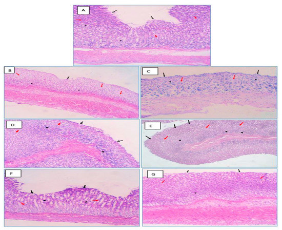 Histological pictures of stomach specimens stained with hematoxylin and eosin from the indomethacin-induced ulcer model in rats: Normal control group (A), disease control group (B), blank beads-treated group (C), free OMP-treated group (D), CURC-only-loaded beads-treated group (E), OMP-only-loaded beads-treated group (F), and CURC/OMP-loaded beads-treated group (G). (A) Uniform gastric tissue showing regular epithelial cell covering (Black arrow), overlying lamina propria showing few chronic inflammatory cell infiltrates (Arrowheads), and uniform mucous-secreting gastric glands (Red arrows). (B) There is significant ulceration in the surface epithelium (Black arrows). The lamina propria is chronically lymphoplasmacytic (Black arrowheads). There are several foci of atrophic glands (Red arrows). (C) There are eroded surface linings (Black arrows). There is significant atrophy in mucosal glands (Red arrows) and foci of chronic lymphoplasmacytic infiltrate involving lamina propria (Arrowheads). (D) There is still an eroded surface epithelium (Black arrows) and the partial recovery of the mucosal glands (Red arrows), with a reduction in chronic inflammatory cell infiltrate (Black arrowheads). (E) There is still an eroded surface epithelium (Black arrows) and the partial recovery of the mucosal glands (Red arrows), with a reduction in chronic inflammatory cell infiltrate (Black arrowheads). (F) There is some restoration of the surface epithelium (Black arrows) and complete recovery of the mucosal glands (Red arrows), with a reduction in chronic inflammatory cell infiltrate (Black arrowheads). (G) There is a restoration of the surface epithelium (Black arrows) and complete recovery of the mucosal glands (Red arrows), with a significant reduction in chronic inflammatory cell infiltrate (Arrowheads) in the OMP/CURC-treated rats (H&E, 100×). OMP: omeprazole, CURC: curcumin.