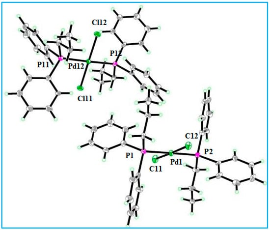 | Cl2–Pd1–P2 | 90.77(10) | Cl12–Pd12–P12 | 89.77(10) |