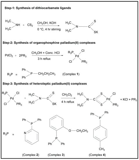 - Khan, H.; Badshah, A.; Said, M.; Murtaza, G.; Ahmad, J.; Jean-Claude, B.J.; Todorova, M.; Butler, I.S. Anticancer metallopharmaceutical agents based on mixed-ligand palladium (II) complexes with dithiocarbamates and tertiary organophosphine ligands. Appl. Organomet. Chem. 2013, 27, 387–395. [Google Scholar] [CrossRef]