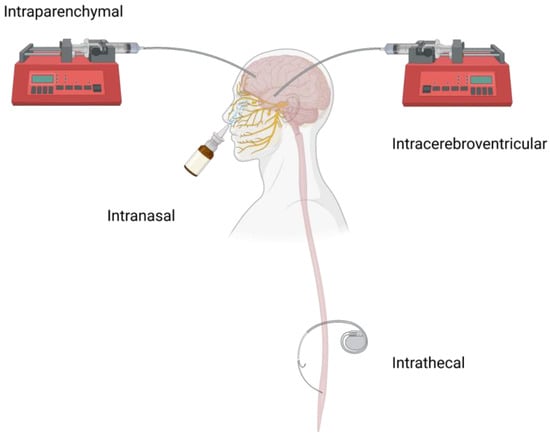 The main approaches for delivering peptide and protein therapeutics into the CNS are through local CNS administration routes (e.g., ICV and intraparenchymal CED injection) since they can avoid the harsh environment in the gastrointestinal tract compared to oral administration and achieve faster and more distribution of therapeutics to a target site in the brain compared to intravenous administration. IT can introduce therapeutics into either the brain or spinal cord and is less invasive and more commonly used for spinal cord diseases or conditions compared to ICV and CED. Intranasal (IN) delivery is another administration route that may achieve brain drug delivery through circumventing the BBB, peripheral metabolism, and serum clearance, and is more patient-friendly compared to other invasive local delivery strategies [15]. Table 1 summarizes representative local CNS administration routes.
