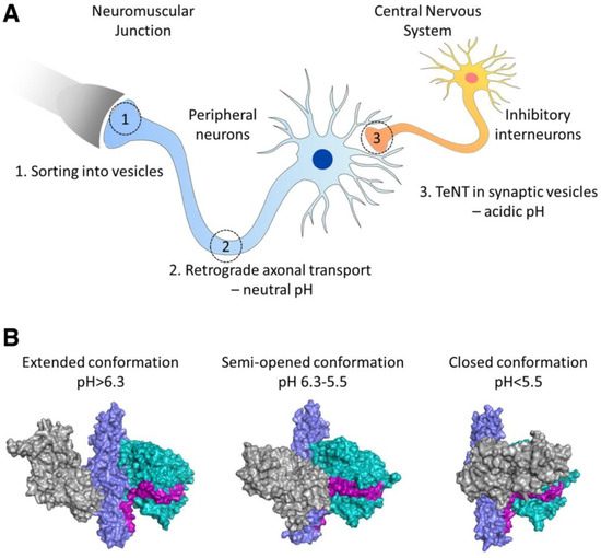 Illustration of the retrograde axonal transport of the tetanus toxin to CNS. TTC (TeNT) can move via axonal transport from the motor neurons of the neuromuscular junction to the motor neurons of the spinal cord and brainstem (A). This transport process is pH-dependent. pH mediated TTC domain rearrangements and transport between neurons (B). Reproduced with permission from [63].