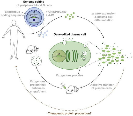 - Hung, K.; Meitlis, I.; Hale, M.; Chen, C.-Y.; Singh, S.; Jackson, S.W.; Miao, C.H.; Khan, I.F.; Rawlings, D.J.; James, R.G. Engineering Protein-Secreting Plasma Cells by Homology-Directed Repair in Primary Human B Cells. Mol. Ther. 2018, 26, 456–467. [Google Scholar] [CrossRef] [PubMed]