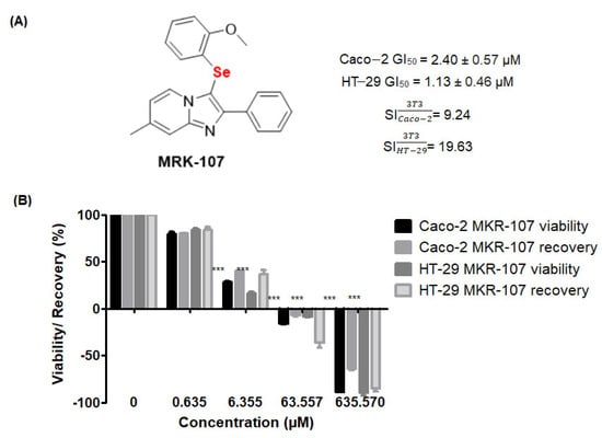 Structure of MRK-107, a selenylated imidazo [1,2-a]pyridine derivative, and its effect on cell viability at different concentrations (0.6–635.57 µM). (A) Structure of MRK-107, GI50 against Caco-2 and HT-29, and selectivity indices (SI). (B) Viability and recovery of Caco-2 and HT-29 cells after 48 h of treatment with MRK-107; *** p < 0.001. Effects on viability were significant at 6.355, 63.55, and 635.57 µM MRK-107. A recovery of less than 50% was deemed irrelevant.