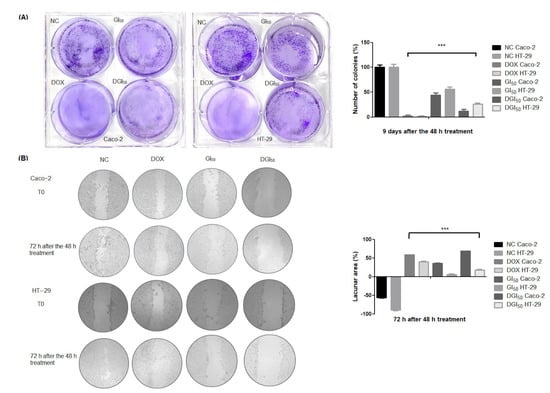 Caco-2 and HT-29 cells were plated in 6-well plates at a density of 500 cells/mL and treated for 48 h with or without MRK-107 at GI50 or DGI50. DOX was used at 3.68 µM. After incubation, the medium was removed and replaced with fresh drug-free medium. After 9 days, the supernatant was removed and colonies were fixed with 10% formaldehyde for 15 min, stained with 0.5% crystal violet for another 15 min, and counted under an inverted microscope [76]. The number of colonies was counted using ImageJ software (National Institutes of Health, USA) [77].
