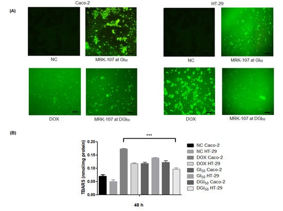 Oxidative stress in colon cancer cells in response to MRK-107 treatment. (A) DCFH-DA staining in the negative control (NC) and Caco-2 and HT-29 cells at 48 h after treatment with MRK-107 or doxorubicin (DOX, positive control). (B) TBARS content of Caco-2 and HT-29 cells at 48 h after treatment, as assessed by spectrophotometry. *** p < 0.001 compared with NC. Scale bar = 20 µm.