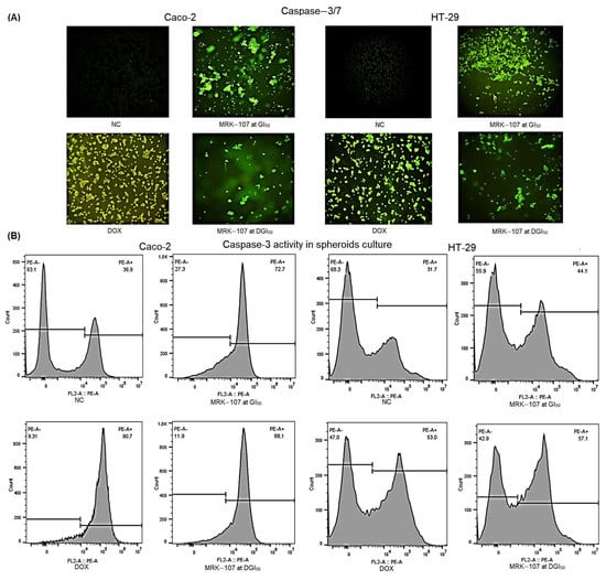 The effect of MRK-107 on caspase-3/7 activities was determined to confirm the flow cytometric results of spheroid cultures. The apoptotic cell death marker CellEvent (Figure 4A) and PE Rabbit Anti-Active Caspase-3 (Figure 4B) were used for flow cytometry assays. MRK-107 increased caspase-3/7 activities after 24 h of treatment in both cell lines at both concentrations.