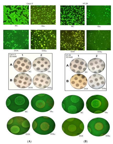 Caco-2 (HTB-37) and HT-29 (HTB-38) cell lines were purchased from American Type Culture Collection (ATCC®, Manassas, VA, USA). Both cell lines were grown in monolayer under the following conditions: 100% humidity, 37 °C, and 95% air, and 5% CO2 atmosphere. Cells were grown in RPMI 1640 (Gibco (Waltham, MA, USA), Life Technologies, Austin, TX, USA) supplemented with 10% fetal bovine serum (Gibco, Life Technologies, USA). Three-dimensional model cells were grown in Dulbecco’s modified Eagle’s medium (DMEM) (Gibco, Life Technologies, USA) supplemented with 10% fetal bovine serum (Gibco, Life Technologies, USA). Both complete growth media were also supplemented with 50 IU/mL penicillin/streptomycin (Gibco, Life Technologies, USA). Cells were collected after the third passage at the logarithmic growth phase. Trypan blue (Sigma–Aldrich, Burlington, MA, USA) was used to count live cells. MRK-107 was synthesized, and a stock solution of MRK-107 was prepared in dimethyl sulfoxide (DMSO) (Sigma–Aldrich, USA). Cells were exposed to MRK-107 and DOX (positive control) (Eurofarma, Brazil) for 48 h.