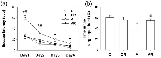 Spatial memory assessed by the Morris water maze. (a) Escape latencies to the invisible platform in the Morris water maze test (mean ± SEM). Rats in the A group swam for a longer period to locate the invisible platform on acquisition days 1, 2, 3, and 4 than rats in the other three groups (all p < 0.05). Resveratrol intake reversed this deficit (A vs. AR, p < 0.05, on days 1 and 2 of acquisition). (b) A significant difference in retention memory was detected between the four experimental groups on day 5. Group A exhibited less retention time in the previously invisible platform quadrant than group C (C vs. A, p < 0.05). Resveratrol intake reversed this deficit (A vs. AR, p < 0.05). * p < 0.05, vs. C group; # p < 0.05 vs. A group. C: control group; CR: control rats that received oral resveratrol; A: asymmetric dimethylarginine infusion group; AR: asymmetric dimethylarginine infusion group that received oral resveratrol; n = 10, each group.