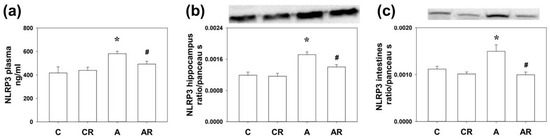 NLRP3 inflammasome activation in plasma (a), dorsal hippocampus (b), and ileum (c). Increased NLRP3 expression in group A rats was consistently found in the plasma (ELISA), dorsal hippocampus (WB), and ileum (WB) as compared to group C. The AR group had lower NLRP3 expression than group A. * p < 0.05 vs. C group; # p < 0.05 vs. A group. n = 7–10, each group.