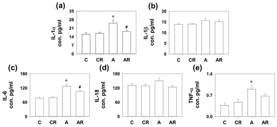 Cytokine expression in dorsal hippocampus. Increased IL-1α (a) and IL-6 (c) expression was found in the dorsal hippocampus of rats in group A compared to those in group C. In addition, the AR group had lower IL-6 (c) expression than group A. However, there were no significant differences in IL-1β (b), IL-18 (d) and TNF-a (e) among the four study groups. * p < 0.05 vs. the C group; # p < 0.05 vs. A group. n = 7–10, each group.
