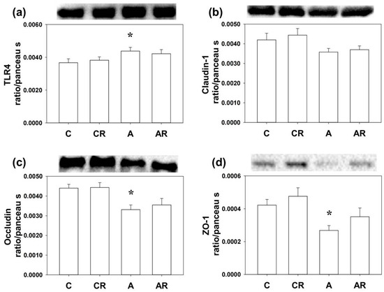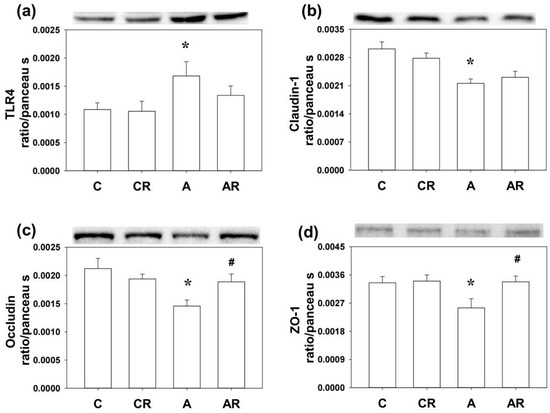 Western blot results in the dorsal hippocampus. Increased TLR4 (a) and decreased Claudin-1 (b), occludin (c), and ZO-1 (d) expression were found in group A compared to group C. The AR group reversed the decrease of occludin (c) and ZO-1 (d) levels in group A. * p < 0.05 vs. the C group; # p < 0.05 vs. the A group.