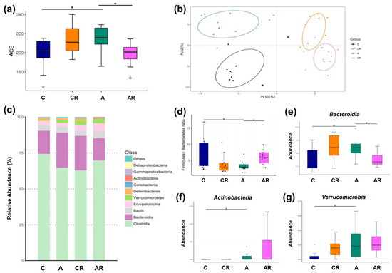 Gut microbiota composition in four experimental groups. α-diversity measured by abundance-based coverage estimator (ACE) index (a). β-diversity using partial least squares discriminant analysis (PLS-DA) (b). Relative abundance of the top 10 classes of gut microbiota (c). Firmicutes to Bacteroidetes (F/B) ratio (d). Relative abundance of the class Bacteroidia (e), Actinobacteria (f), Verrucomicrobiae (g). Data are shown as means ± SEM; n = 10/group. * p < 0.05.